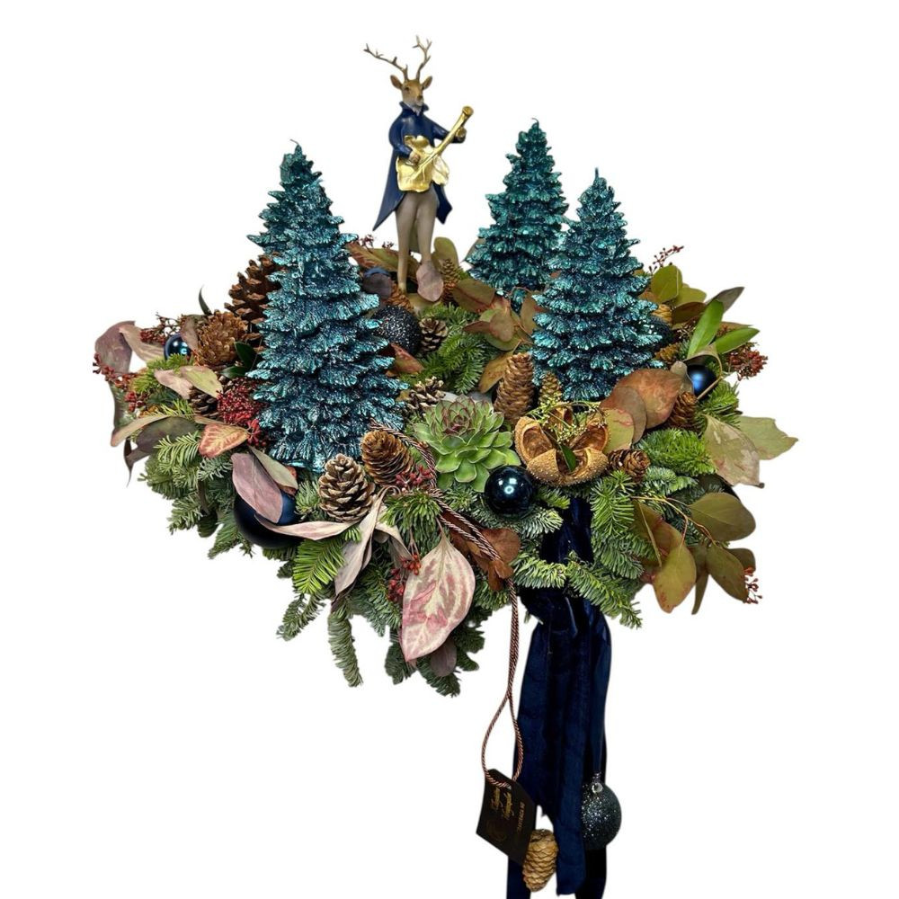 A kompozíció fenyős, zöldes és szukkulenses alapra épül, természetes kiegészítőkkel díszítve. Középpontjában egy elegáns kék szarvas figura áll, amely különleges karaktert ad a koszorúnak. A fenyő alakú gyertyák még ünnepélyesebbé teszik a dekorációt, így tökéletes választás otthonodba vagy ajándéknak.