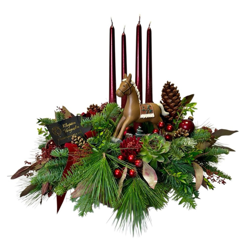 A különleges vegyes alap fenyőből, zöld növényekből és szukkulensekből áll, amelyet bogyók, termések és bordó gyertyák gazdagítanak. A kompozíció középpontjában egy bájos hintaló figura áll, amely igazán nosztalgikus, mesés karácsonyi hangulatot teremt.