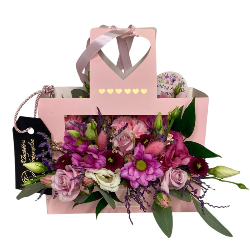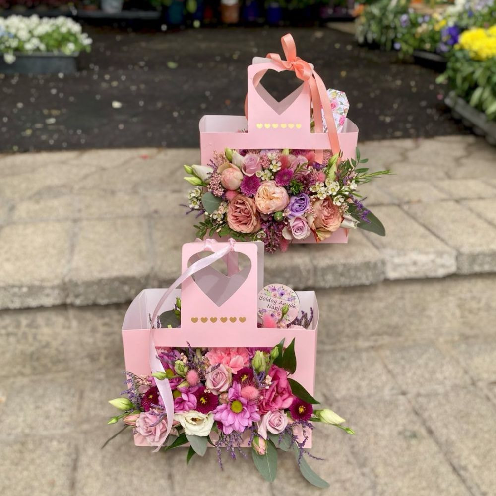 Anyák napi füles virágbox – pink–rózsaszín