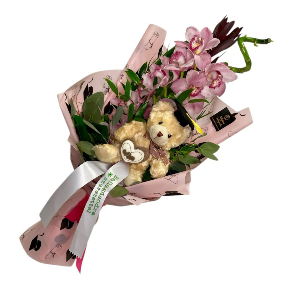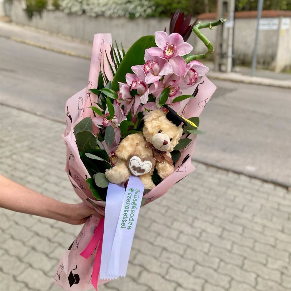 Ez a csajos, rózsaszín ballagási csokor cimbidiummal és plüss macival igazán különleges és meghitt választás a nagy napra. A cimbidium elegáns, egzotikus megjelenése modern és látványos hatást ad a kompozíciónak, míg a plüss maci szerethető, személyes részlettel teszi teljessé az ajándékot. A szerencsehozó bambusz pedig még inkább az alkalomhoz illő, szimbolikus kiegészítővé varázsolja a csokrot.