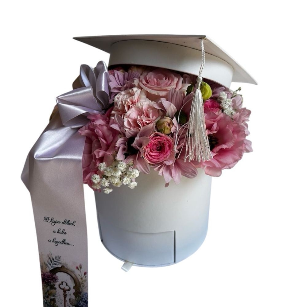 Ballagási kalapos box vegyes virágokkal, ballagási szalaggal - rózsaszín