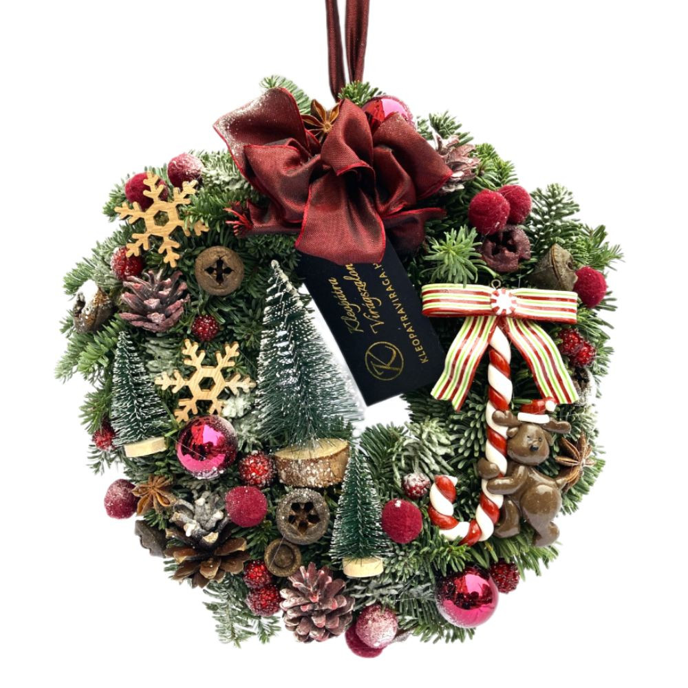 A 20 cm átmérőjű dekoráció középpontjában egy bájos cukorbot áll, amelyet masni és szarvas figura egészít ki. A fenyők, fa díszek és bordó gömbök kavalkádja pedig igazán izgalmassá, különlegessé teszi a kompozíciót.
