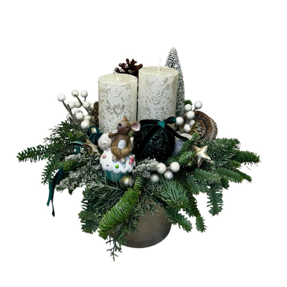 A kompozíció élő fenyőből, bogyókból és zöld gömbökből áll, középpontjában egy bájos egérke figura található. A különleges fehér gyertyák még ünnepélyesebbé teszik az asztaldíszt. Ideális az adventi asztalra vagy ajándéknak.