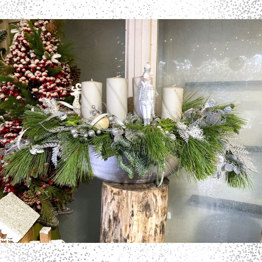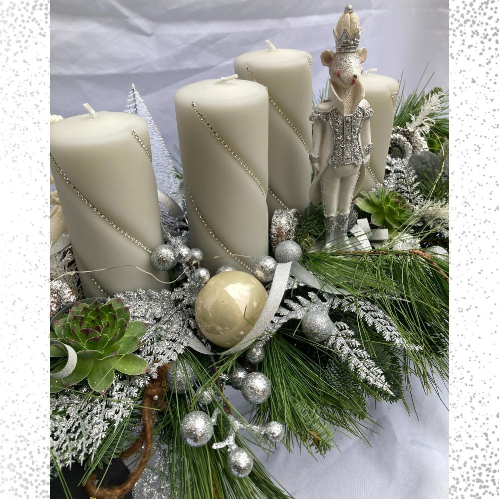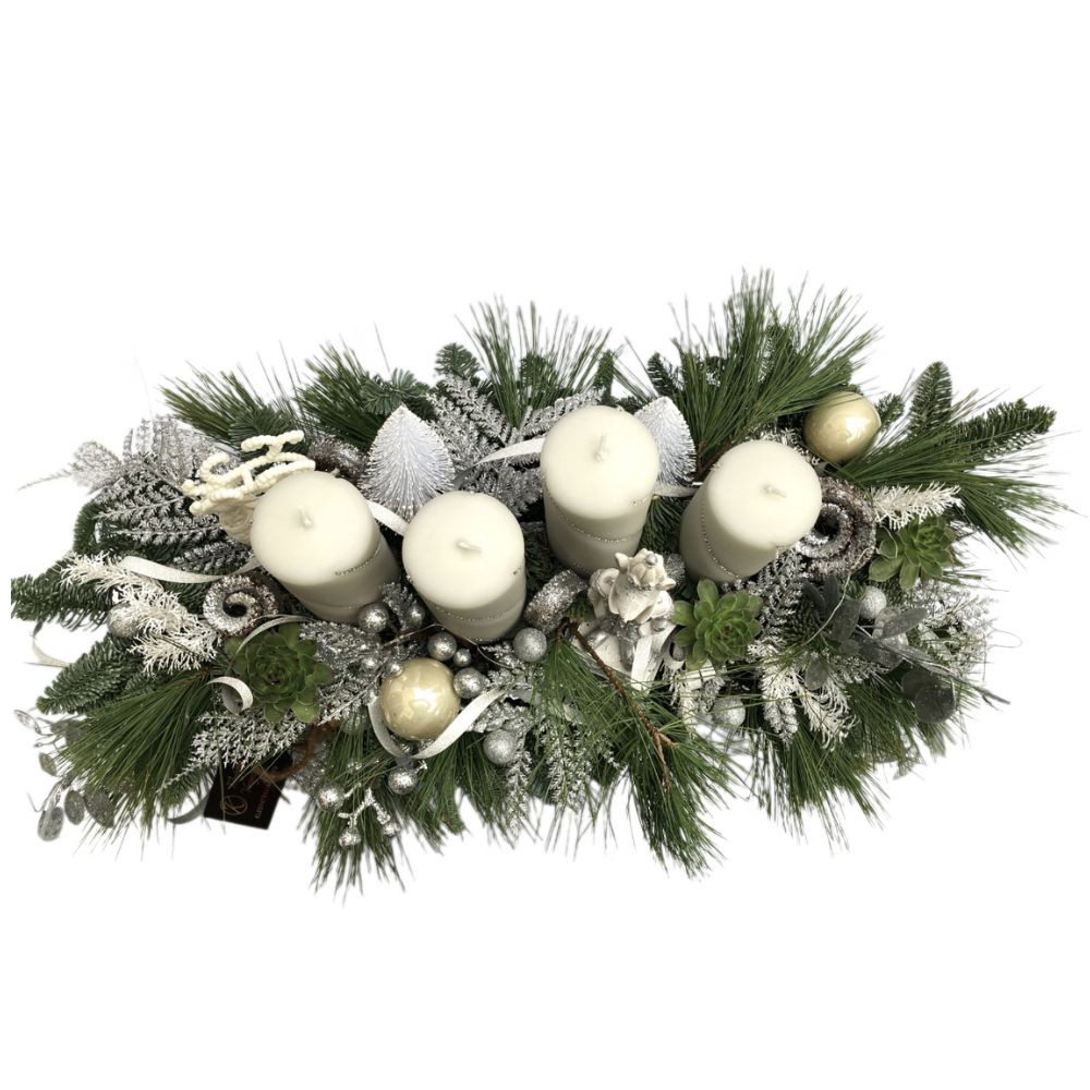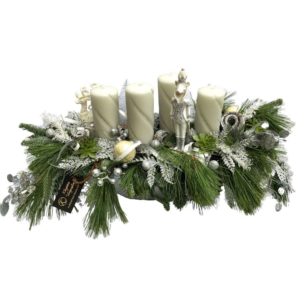 A csónak alakú ezüst műanyag tálba helyezetett fenyő alapot ezüst díszek, csillogó gömbök és elegáns ezüst ágak teszik ünnepivé, amit egy fehér szarvas figura és apró fenyők gazdagítanak. Az összhatást tovább fokozza a fehér-ezüst álló szarvas és az ezüst kövekkel díszített elegáns gyertyák ragyogása.