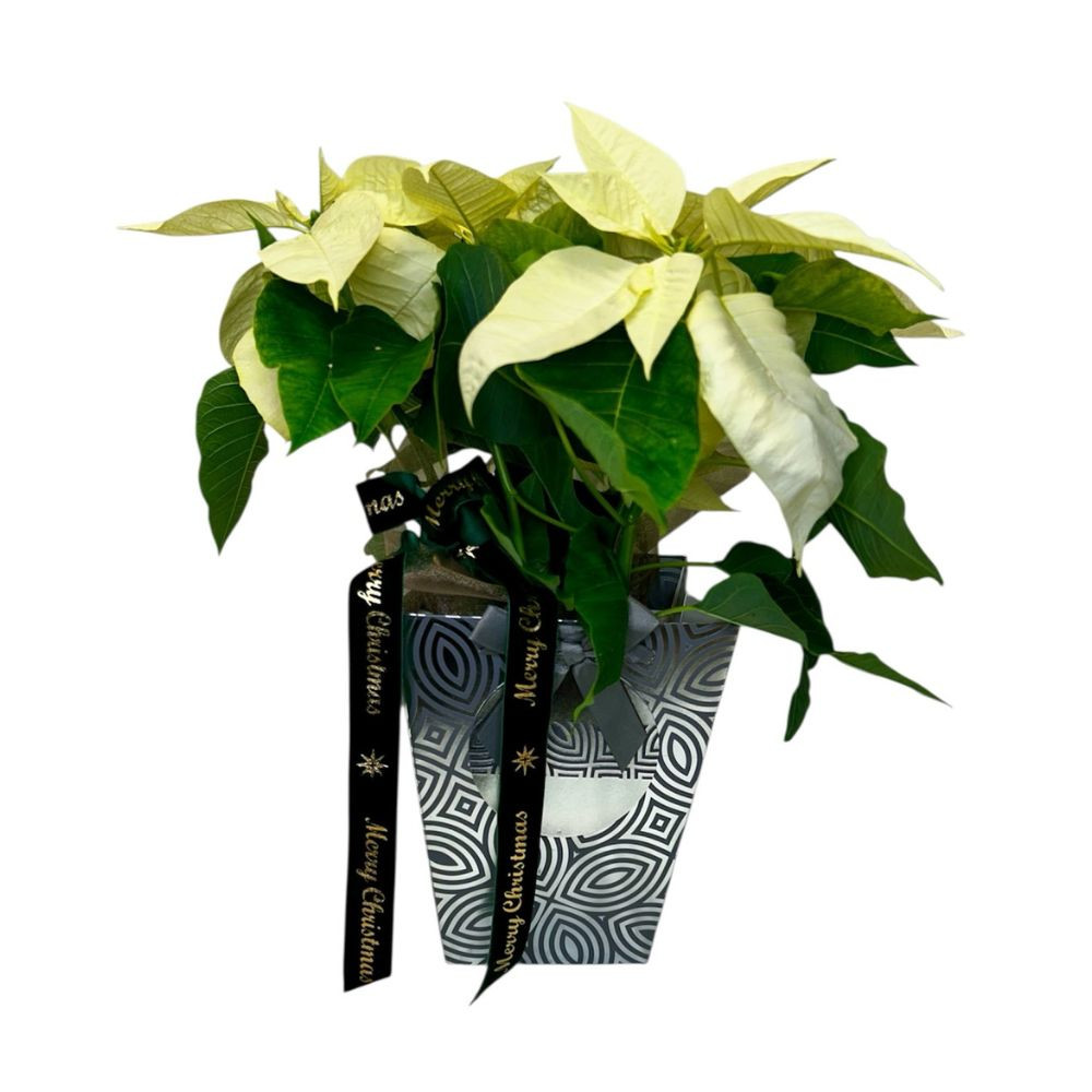 Tiszta fehér mikulásvirág stílusos dísztasakban, tökéletes karácsonyi ajándék vagy dekoráció. Letisztult színe miatt eleganciát és ünnepi hangulatot kölcsönöz bármely helyiségnek.