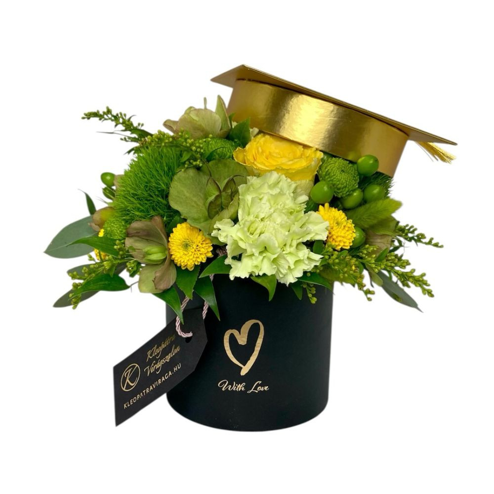 Ez a fekete-arany kalapos ballagási box elegáns és modern választás a ballagás ünnepi pillanataira. A fekete-arany doboz letisztult, prémium megjelenést ad az összeállításnak, amelyet a gondosan összeállított zöld-sárga virágkompozíció - rózsa, santini, szegfű, díszszegfű, hunyor - friss és természetes hatással tesz különlegessé. A kalap díszítés ünnepélyes, egyedi karaktert kölcsönöz a doboznak.