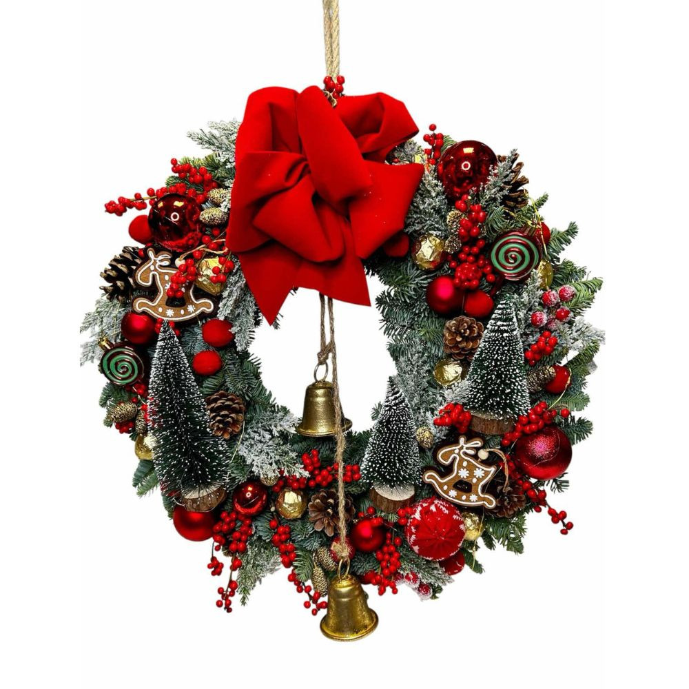 A hagyományos karácsony szerelmeseinek készült ez a látványos, piros színvilágú ajtódísz. Dús, élő fenyőalapra épül, amelyet bogyók, gömbök, apró fenyőfák, természetes termések és sok-sok ünnepi részlet díszít. A kompozíció fénypontja az elmaradhatatlan karácsonyi csengettyű, amely azonnal meghozza az ünnep varázsát.