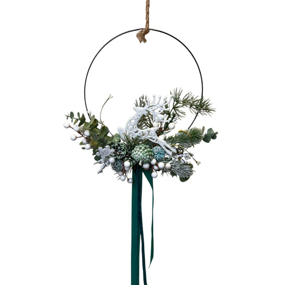 Ha szereted a visszafogott, elegáns karácsonyi stílust, ez a különleges kopogtató tökéletes választás. A modern fémkeret alsó részén egy finom, havas téli fenyőalap kapott helyet, bogyókkal és néhány természetes díszítéssel – éppen annyival, hogy meghitt, mégis minimalista hatást keltsen.