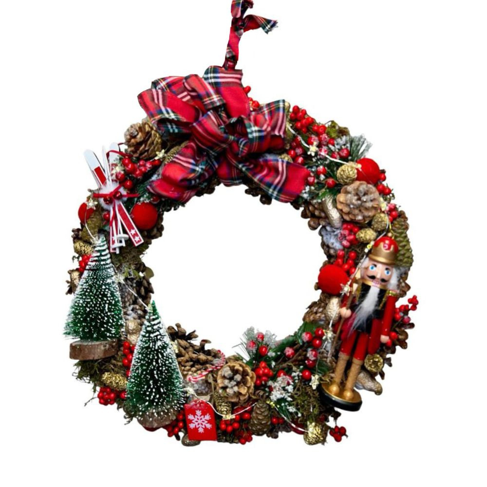 Különleges, látványos karácsonyi kopogtató természetes toboz alapon, amelyet aprólékosan felépített, gazdag díszítés tesz igazán ünnepivé. Termések, bogyók, apró karácsonyi figurák és a kompozíció központi eleme, a klasszikus diótörő együtt hozzák el az igazi karácsonyi hangulatot. A finoman elhelyezett világítás meleg ragyogással emeli ki a részleteket, így a kopogtató nappal és este is gyönyörűen mutat.