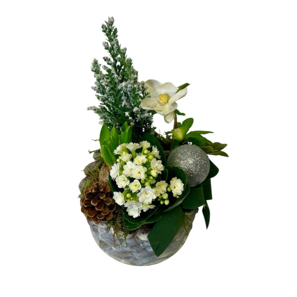 A 16 cm átmérőjű kaspóban, kb. 30 cm magas összeültetés gondosan válogatott növényeket tartalmaz: korall, hunyor és jácint tuja. Elegáns, ünnepi hangulatot kölcsönöz asztalodnak, ablakpárkányodnak, és ajándéknak is tökéletes választás.