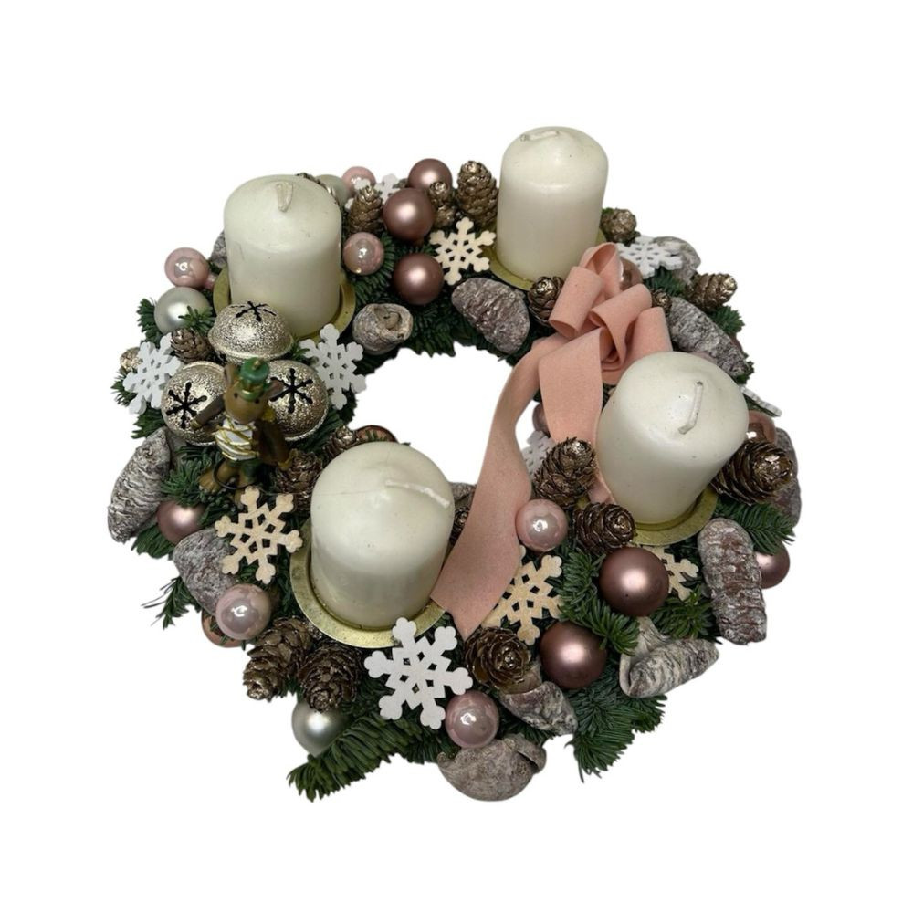 Ez a letisztult, pasztell adventi koszorú a kedves kis egérkével igazán különleges hangulatot teremt. Finom színek, elegáns gömbök, natúr termések és egy hófehér gyertya adják azt a visszafogott, békés karácsonyi hangulatot, amely tökéletesen illik modern és klasszikus otthonokba is. Stílusos, bájos és egy csipetnyi mesével fűszerezett ünnepi dekoráció.
