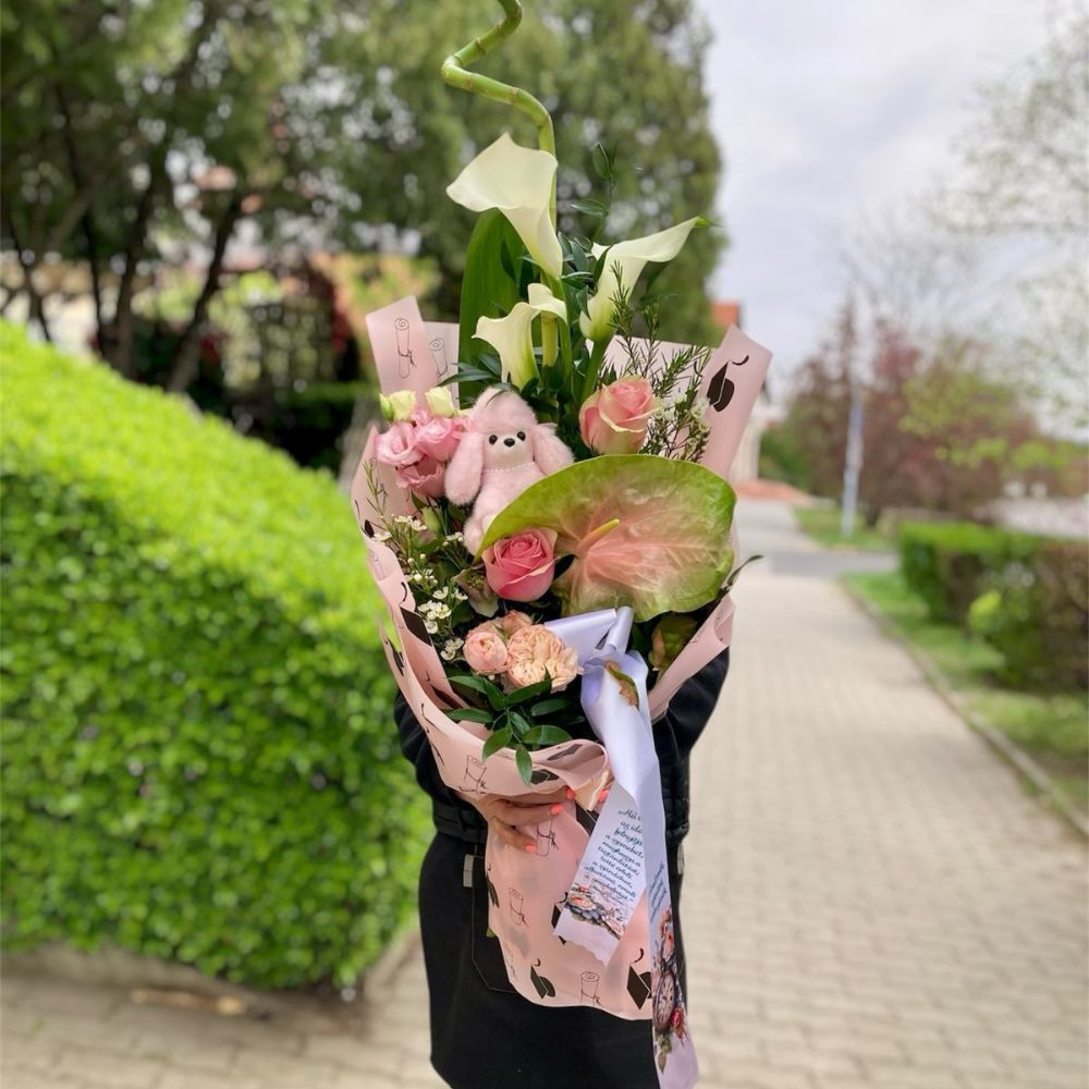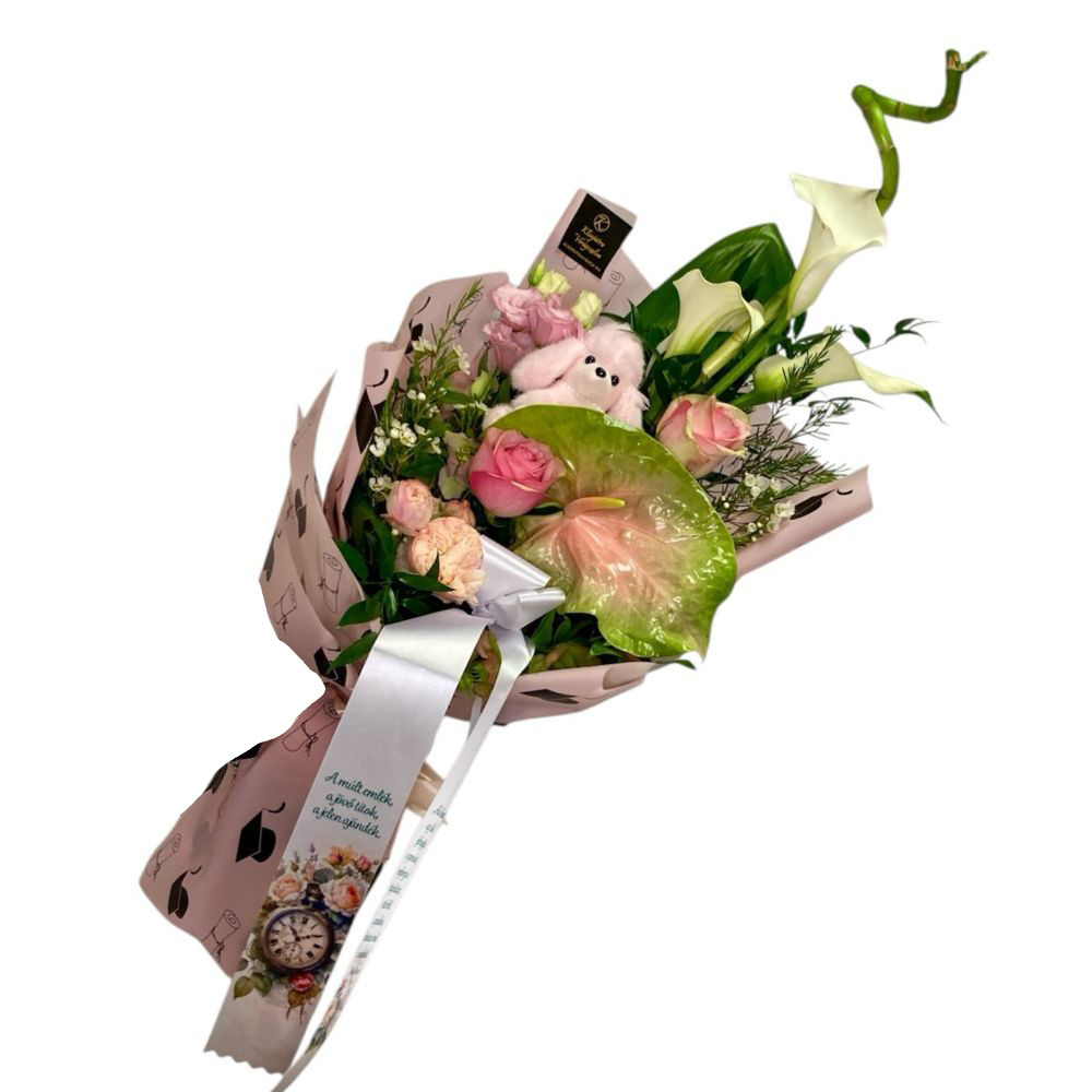 Ez a rózsaszín ballagási csokor flamingóval és plüss kutyussal igazán kedves és különleges választás a nagy napra. A flamingó egyedi, látványos megjelenést ad a csokornak, míg a plüss kutyus játékos és szerethető részlettel teszi személyessé az ajándékot. A szerencsehozó bambusz pedig még inkább az alkalomhoz illővé varázsolja a kompozíciót.