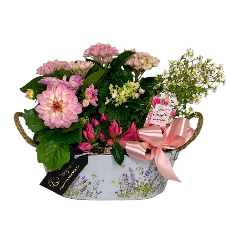 Ez a rózsaszín anyák napi összeültetés egy bádogkaspóban készült, ahol a tartó egyszerűsége jól kiemeli a virágok dús, hosszabb távon is változó szépségét. Ez nem egy „pillanatnyi” dekoráció, hanem egy olyan összeállítás, ami idővel is folyamatosan alakul és él.