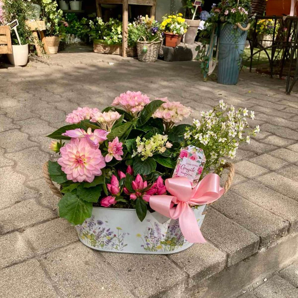 Rózsaszín összeültetés bádogkaspóban hortenziával