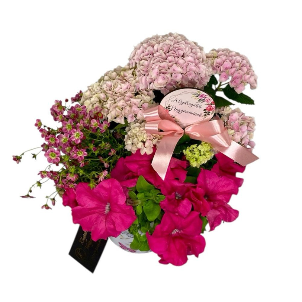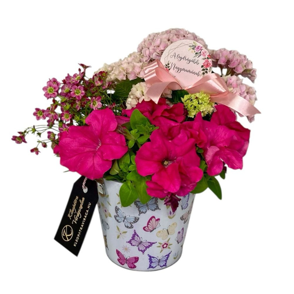 Ez a rózsaszín összeültetés egy dekoratív, lepkés bádogkaspóban kapott helyet. A különleges, 150 napos virágzású hortenzia, petúnia, és sziklakerti növények kombinációja játékos, mégis romantikus hangulatot ad a kompozíciónak. Az összhatás nőies, friss és vidám anyák napi meglepetés, amely nemcsak ajándék, hanem egyben hangulatteremtő dekoráció is, legyen szó teraszról, erkélyről vagy az otthon egy kedvenc pontjáról.