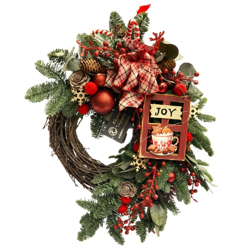 Fonott vessző alapra készült, fenyővel, piros bogyókkal, pirois gömbökkel és figurákkal. Hagyományos hatását a termések, tobozok valamit a klasszikus karácsonyi kockás masni tovább fokozzák. A világító ledek végül karácsonyi ragyogást adnak hozzá. Így keveredik a hagyományos és a modern csodálatos összhangban, egyetlen ajtódíszben.