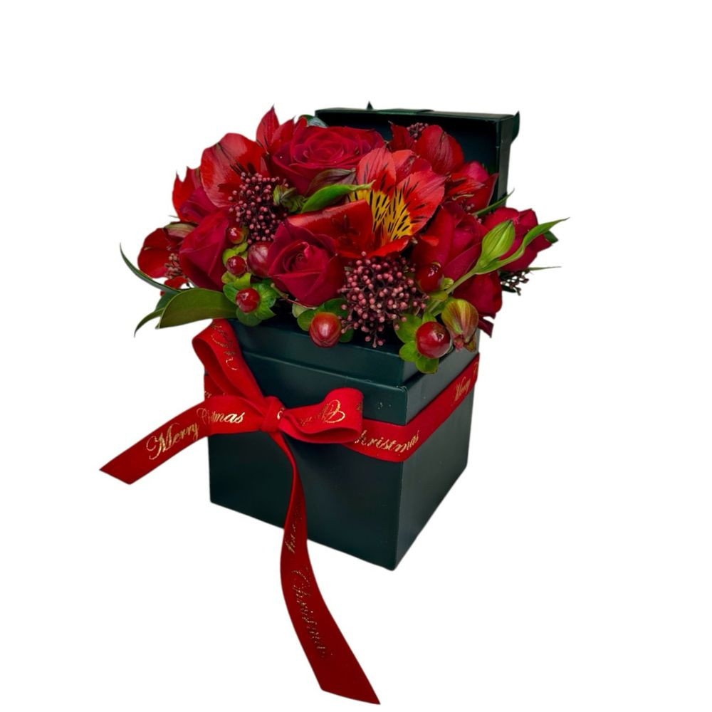 Stílusos zöld karácsonyi kockabox, benne piros csoportos rózsa, alstroemeria, skimmia és hypericum gondosan válogatott kompozíciója. A karácsonyi szalag ünnepi hangulatot kölcsönöz a kompozíciónak, így tökéletes ajándék szeretteidnek vagy elegáns dekoráció az otthonodba.