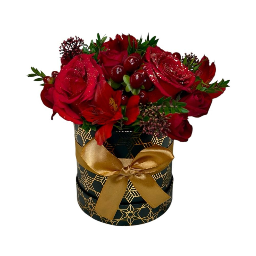 Exkluzív arany-fekete dobozban érkező karácsonyi kompozíció, amely vörös rózsákkal, alstroemeriával, csoportos rózsával és skimmiával van díszítve. A bogyók finom kontrasztot adnak a gazdag piros árnyalatoknak, míg a stílusos doboz eleganciát kölcsönöz az ajándéknak.