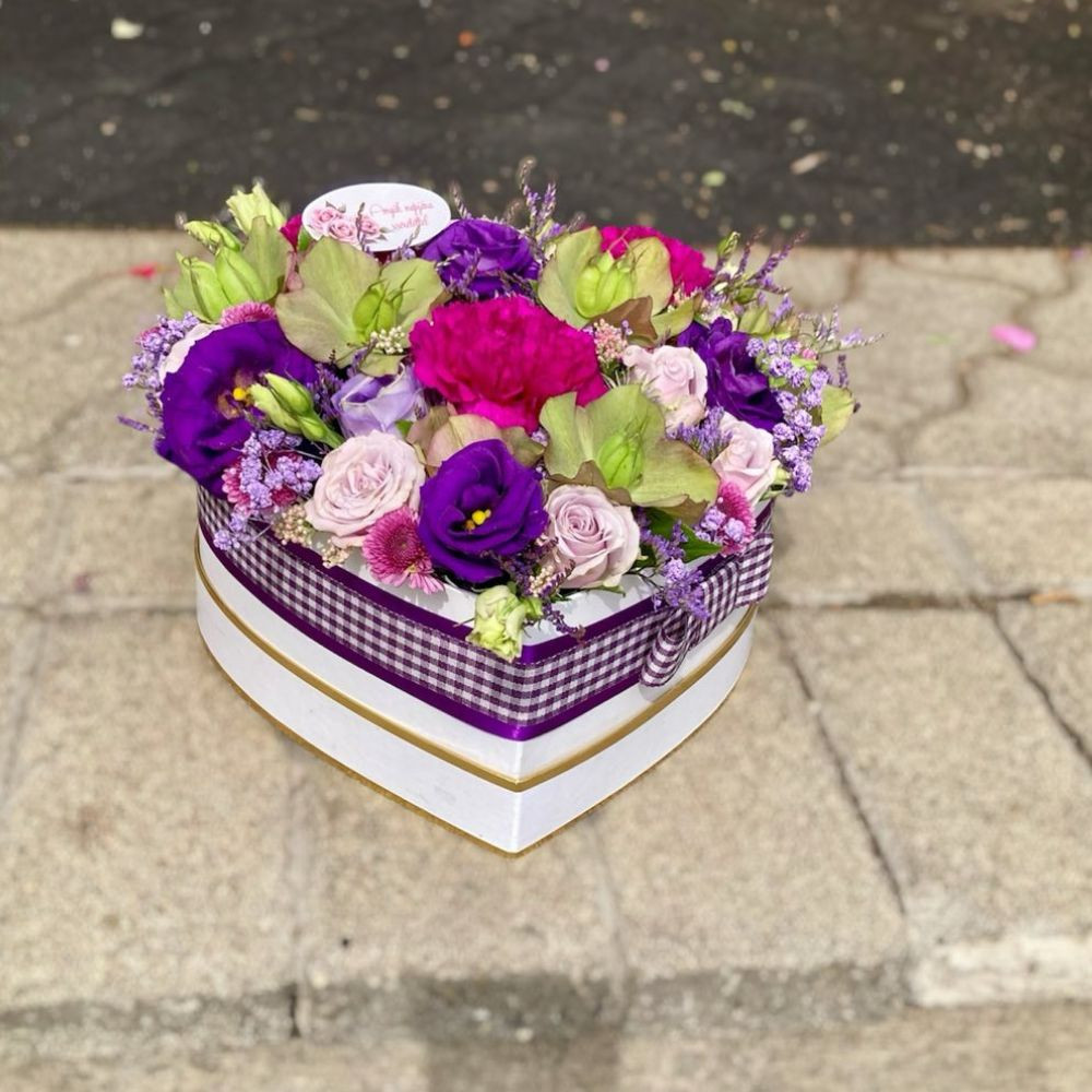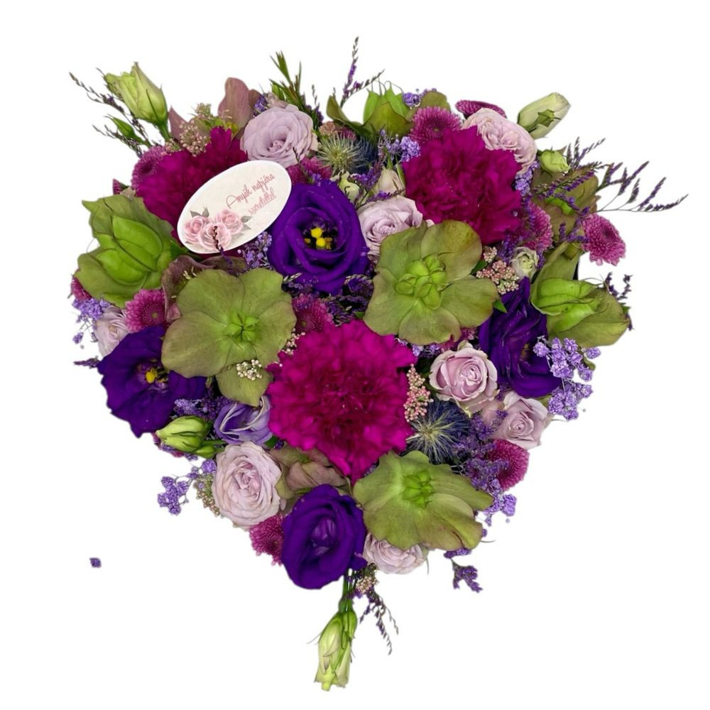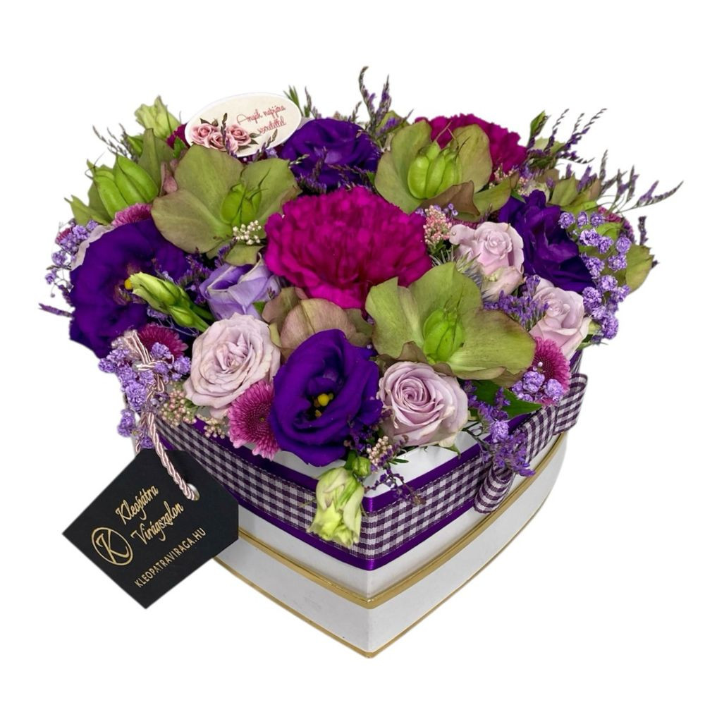 Ez a lila–fehér szív alakú virágbox egy igazán kifejező ajándék: nemcsak a virágok szépségével, hanem formájával is üzen. A szív forma finoman hangsúlyozza az alkalom érzelmi jelentését, miközben a lila és fehér árnyalatok elegáns, letisztult összhatást teremtenek.