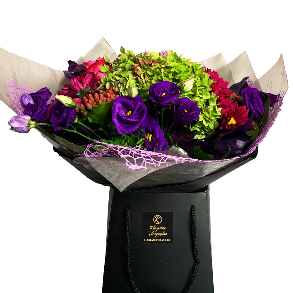 Extravagáns táska csokor lila, pink és zöld virágokkal. Csodaszép, élénk színű kompozíció 7-9 szál friss vegyes virágból, elegáns fekete dísztasakban. A csokor átmérője kb. 35 cm. Elkészítéséhez hortenziát, rózsát, eustomát, santinit, zöldeket használtunk fel.